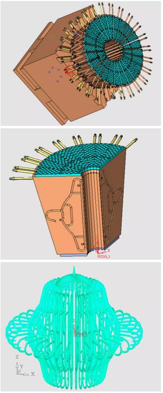 模塊的二面受到的作用力幾乎也是相等的。所以,圓周排列的多層模具的鎖模力,在理論上是等于零的。進一步的發明已經可以做到36層。還是那個衣架,請看下圖: