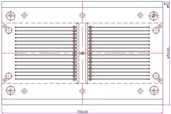多層注塑模具基本上分二大類,第一類是平面排列的,第二類是圓周排列的。平面排列的多層注塑模具,分為4層或者更多層的排列。我們取中間的任何一層來分析:
