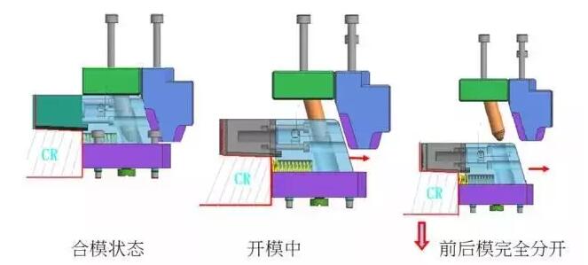 在塑料模具中,利用成型的開模動作,使斜撐梢與滑塊產生相對運動趨勢,使滑塊沿開模方向及水平方向的兩種運動形式,使之脫離倒勾。如下圖所示: