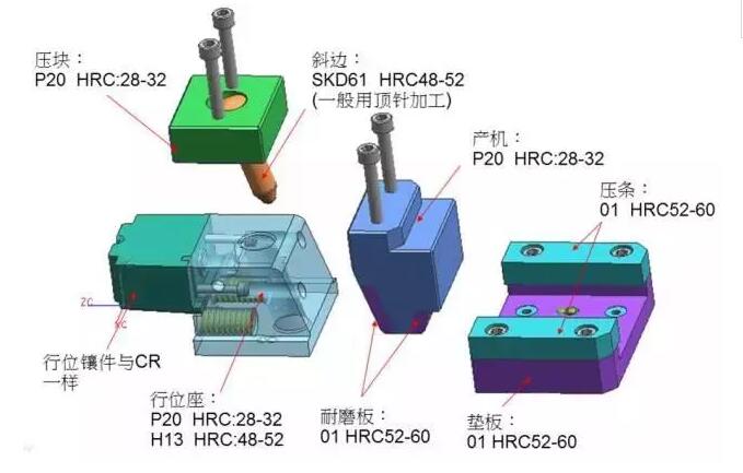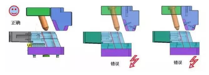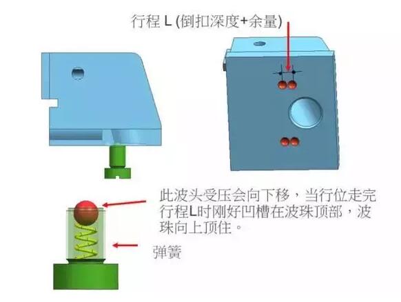 滑塊在開模過程中要運動一定距離,前后模完全分開后,要使滑塊能夠安全回位。滑塊要停在正確的位置,如果滑塊再往前或向后滑行,會導致合模時斜邊與孔對不準發生相撞!所以必須給滑塊安裝定位裝置,且定位裝置必須靈活可靠,保證滑塊在原位不動。