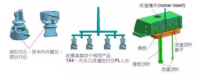 為了防止產品粘前模所以設計行位延時開模,前后模已打開一部分但是行位還沒有滑動,通過行位把產品夾住(有扣位)保證產品在后模。產品柱子大部分在行位上,所以行位要設計運水冷卻!
