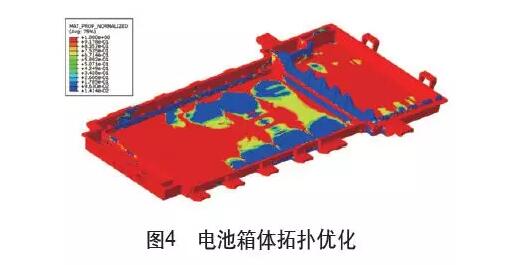 電池包箱體輕量化設計方法主要有拓撲優化、形貌優化、形狀優化和尺寸優化等。在箱體前期設計過程中即概念設計階段一般采用拓撲、形貌和自由尺寸的優化手段;在結構設計后期,對具體的技術要求,需要詳細設計時更多的采用尺寸優化、形狀和自由形狀優化技術,以達到具體的設計要求。如某鑄鋁電池包箱體的拓撲分析,支架安裝位置全約束,模擬電池包實際安裝情況,同時以國標擠壓工況受力分析為邊界;設計響應為電池包的應變能和質量;目標為質量最小;約束為體積減少為初始的80%。經過多次迭代獲得電池包相對密度云圖,如圖4所示,紅色區域為密度接近1的部分,對設計目標的貢獻較大,是必須要保留的或者是要加強的區域。藍色部分的相對密度較低,對設計目標的貢獻小,是我們做輕量化重要的減重途徑。當然拓撲優化后的結果,還必須考慮工程工藝的可行性,綜合考慮箱體的減重方案設施。